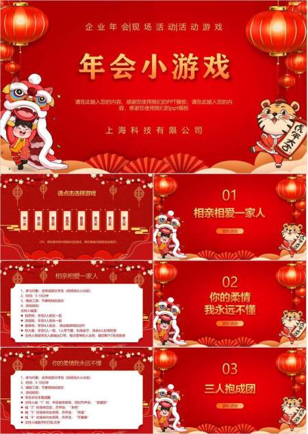 悬挂灯笼男孩舞狮虎年大吉年会游戏PPT模板