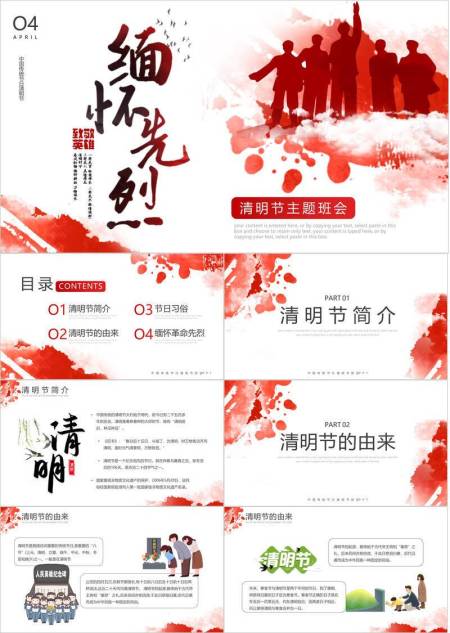 红色主题清明节致敬英雄班会PPT模板