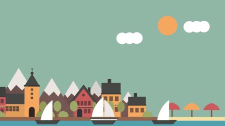绿色卡通风格湖畔小镇PPT背景