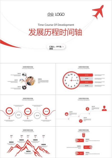 红色飞机虚线轨迹极简企业成长时间轴PPT模板