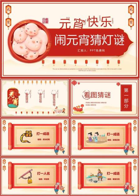 拟人汤圆红灯笼祥云元宵猜灯谜PPT模板