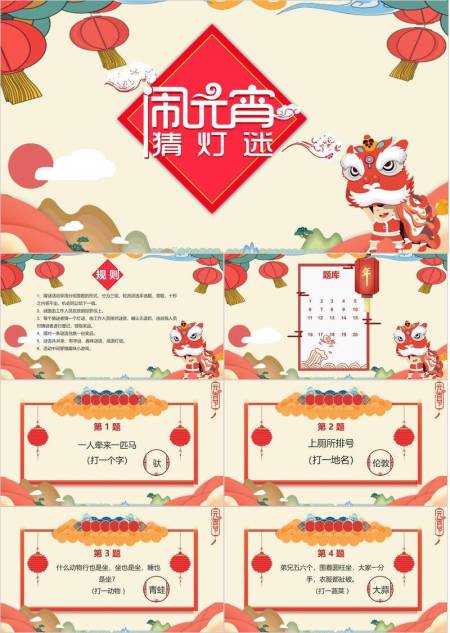 舞狮儿童云朵山峦灯笼元宵猜灯谜PPT模板