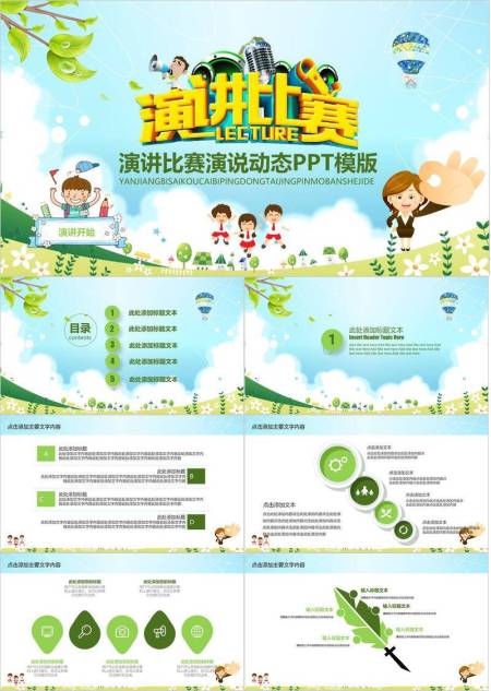 蓝天绿叶卡通儿童演讲比赛PPT模板