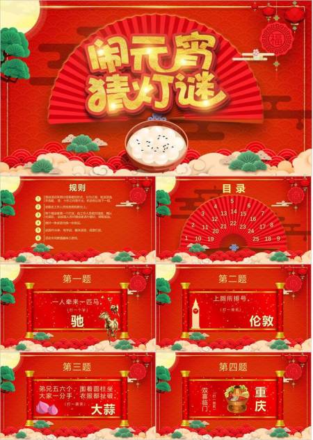 扇形背景金色立体字松树元宵猜灯谜PPT模板