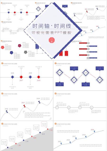 蓝色菱形边框折线企业时间轴合集PPT模板