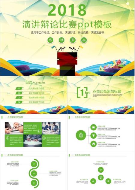 绿多边形红讲台多用途演讲辩论PPT模板