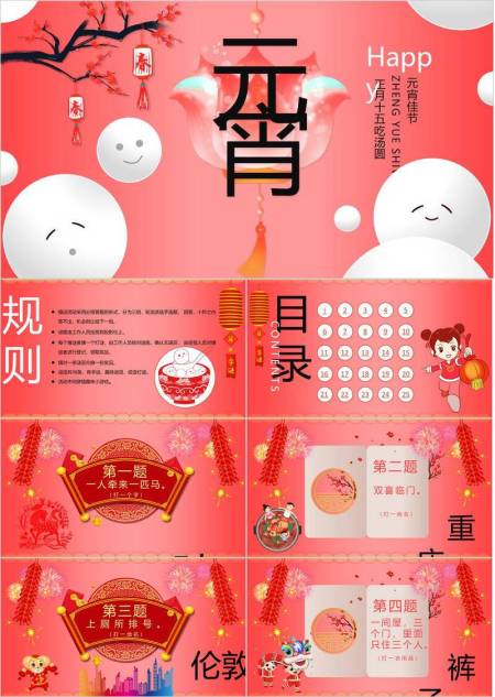 元宵灯谜拟人汤圆梅花灯笼海报PPT模板