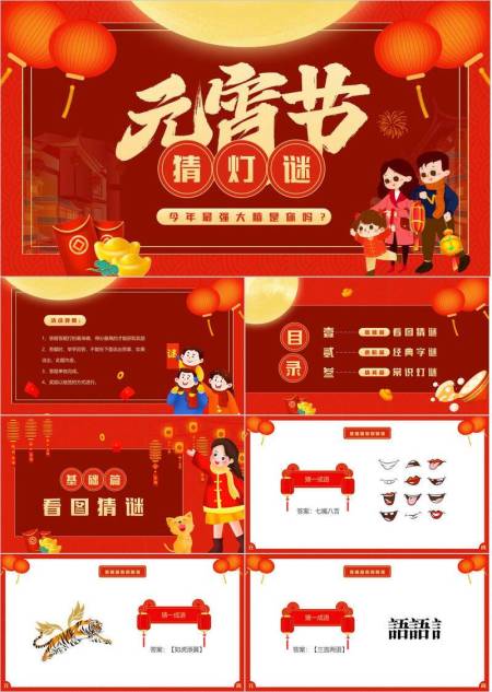 家庭金元宝建筑剪影元宵灯谜活动PPT模板