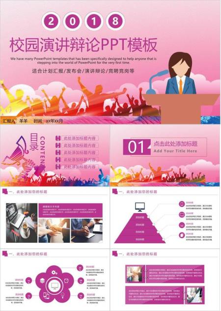 粉斜纹卡通校园演讲辩论PPT模板
