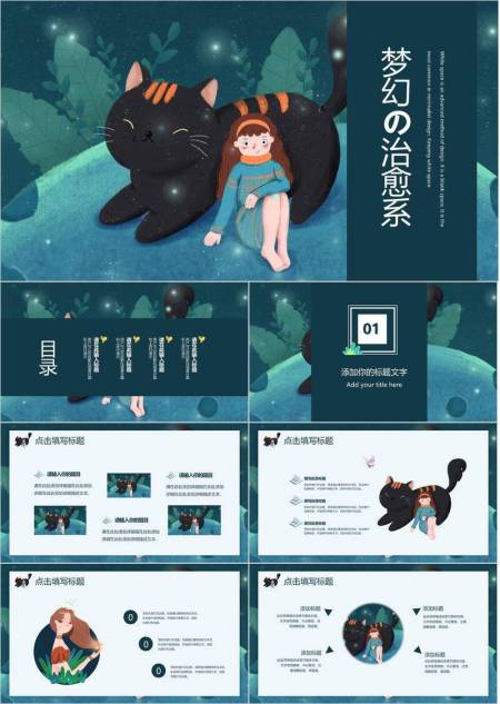 梦幻夜空女孩与黑猫动漫治愈系插画PPT模板