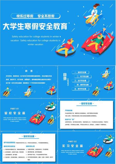 雪橇雪圈动态线条寒假安全娱乐教育PPT模板