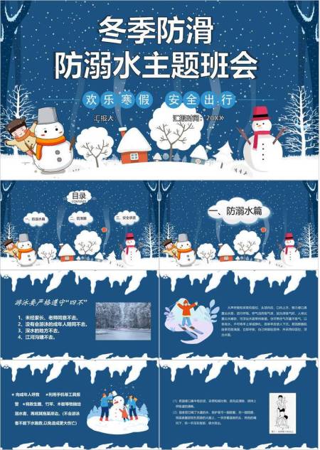 雪人星空雪夜防滑防溺水寒假主题班会PPT模板