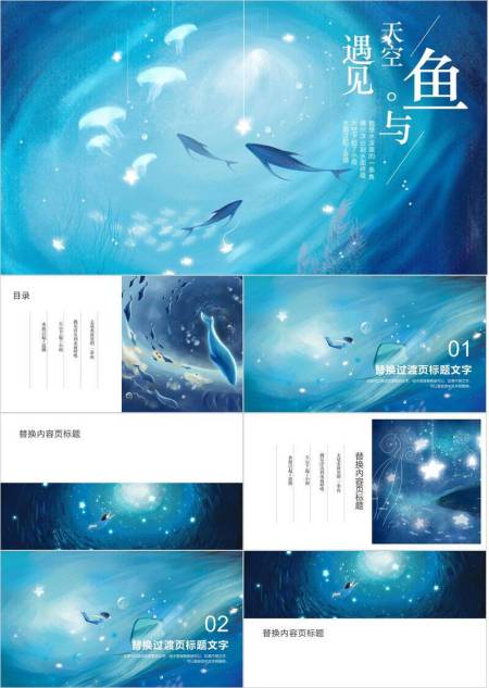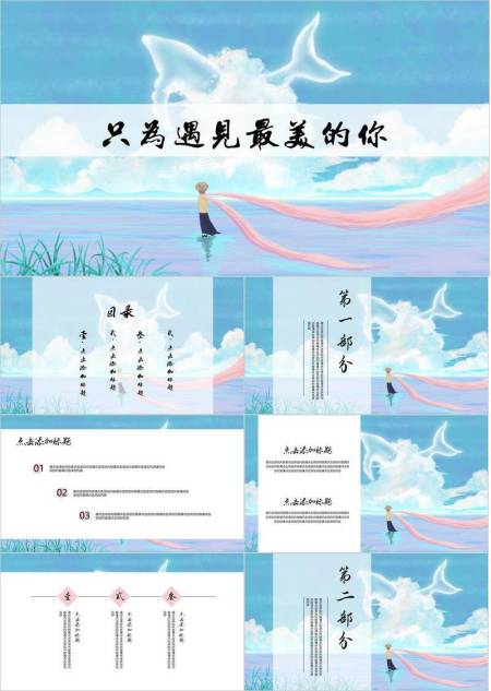 动漫唯美海边天空鲸鱼遇见浪漫主题PPT模板