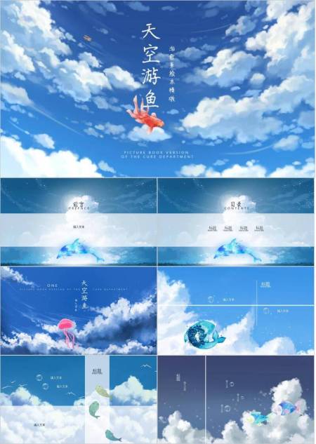 动漫绘本风天空红鲤鱼飞翔治愈手绘PPT模板