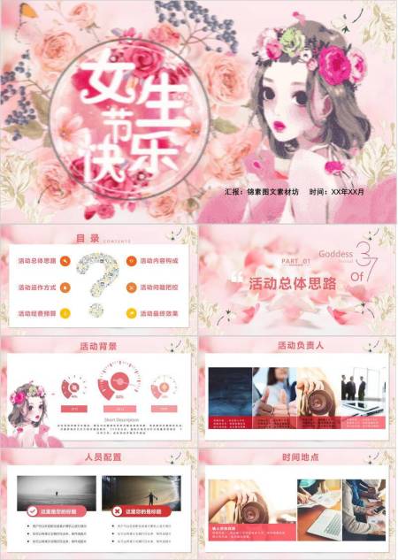 粉色手绘水彩女生节花漾少女祝福PPT模板