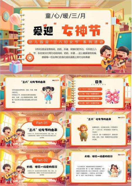 蓝色卡通风格三八女神节幼儿园亲子活动PPT模板