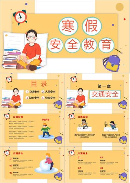 女孩读书圆形框学习图标寒假安全PPT模板