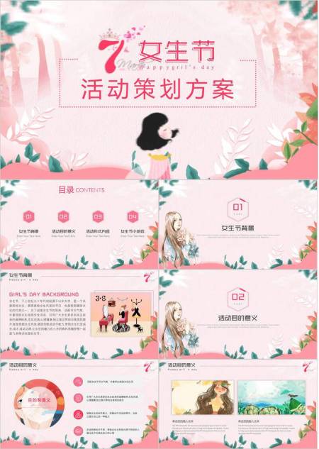 粉色梦幻插画三七女生节活动策划方案PPT模板