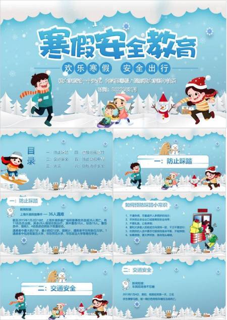 剪纸风格儿童滑雪寒假安全出行PPT模板