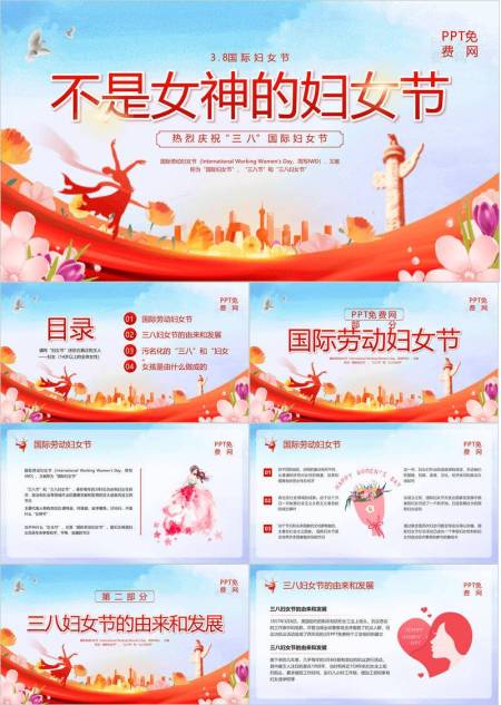 红色国潮插画三八国际妇女节节日宣传PPT模板