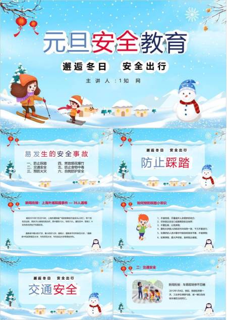 元旦儿童滑雪灯笼寒假安全班会PPT模板