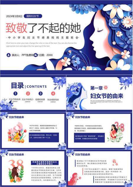 蓝色纸艺插画三八妇女节感恩主题班会PPT模板