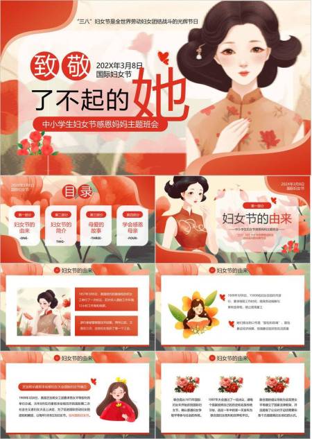 红色国风插画三八妇女节感恩妈妈主题班会PPT模板