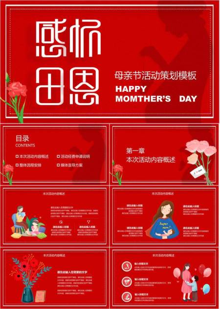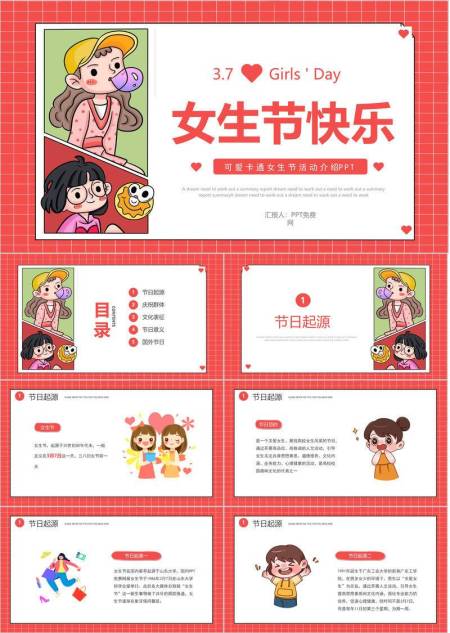 红色卡通拼贴女生节可爱卡通活动介绍PPT模板