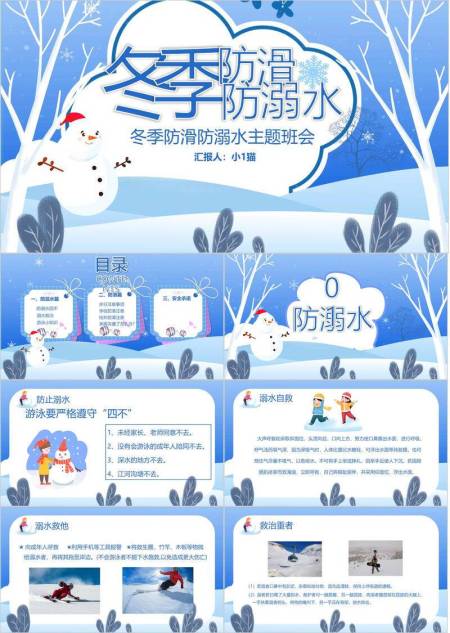 森林枝干雪人防滑防溺水宣传PPT模板
