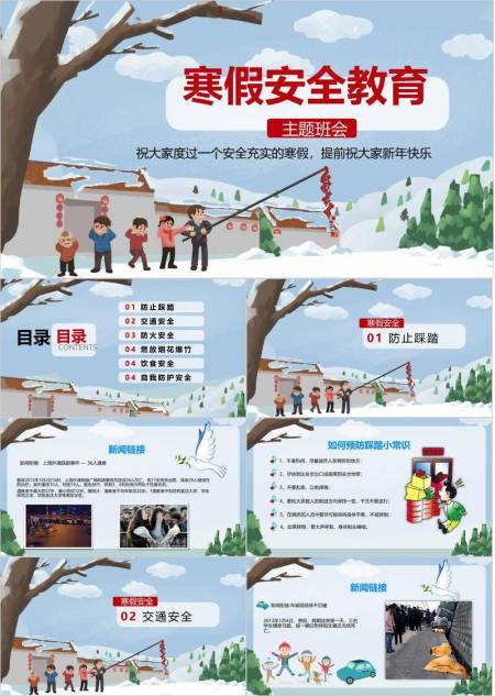 家庭雪景互动寒假安全教育班会PPT模板