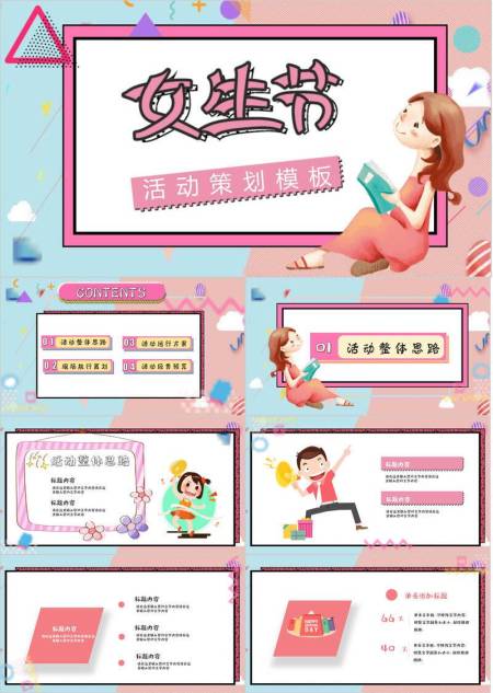 粉色卡通扁平三七女生节活动策划模板PPT模板