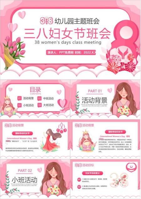 粉色卡通可爱三八妇女节幼儿园主题班会PPT模板