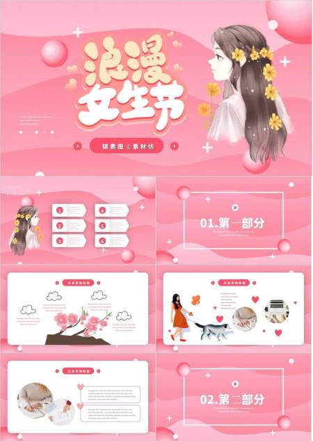 粉色插画唯美女生节浪漫时光宣传PPT模板