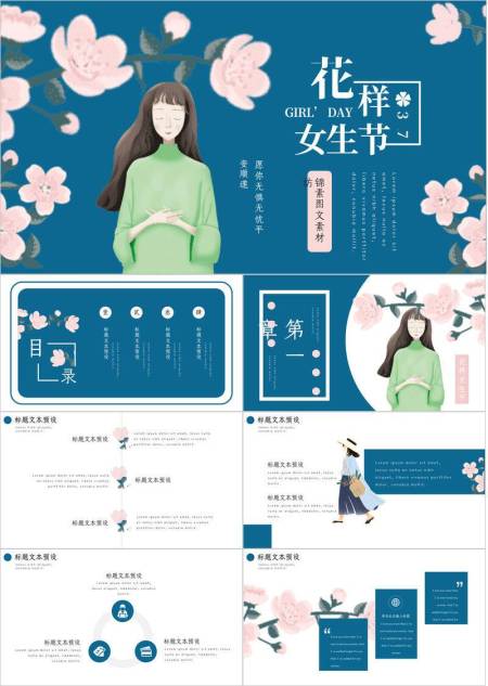 蓝色手绘插画女生节樱花少女文艺演讲PPT模板