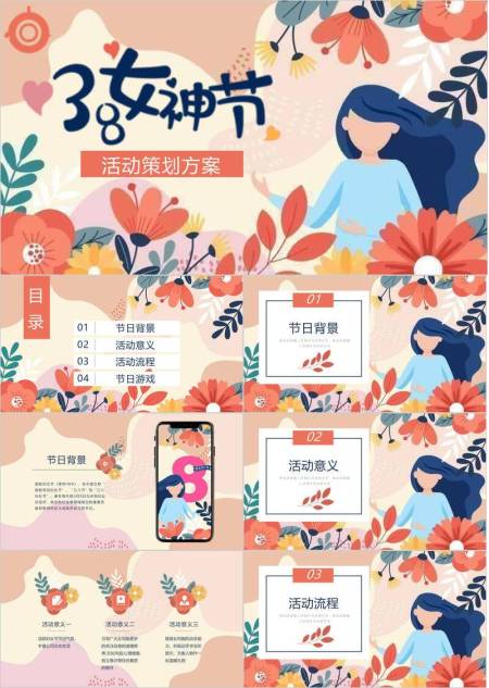 橙色扁平插画三八女神节活动策划方案PPT模板
