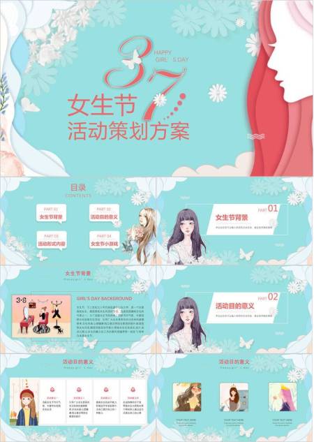 蓝色纸艺剪影女生节活动策划PPT模板