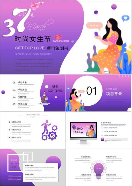 紫色卡通扁平女生节时尚项目策划PPT模板