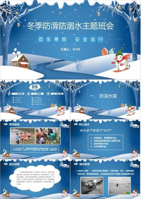 冬夜森林冰凌雪人滑雪寒假安全班会PPT模板