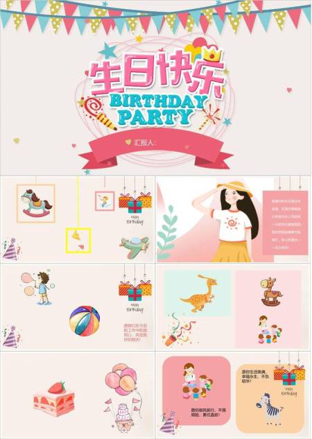 粉红独角兽梦幻儿童生日满月宴PPT模板