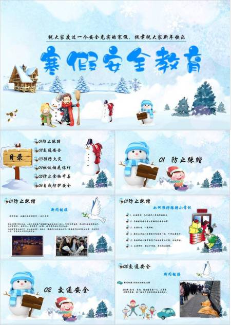 家庭堆雪人木屋寒假安全祝福开场PPT模板