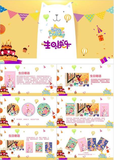 白猫派对欢乐生日贺卡PPT模板
