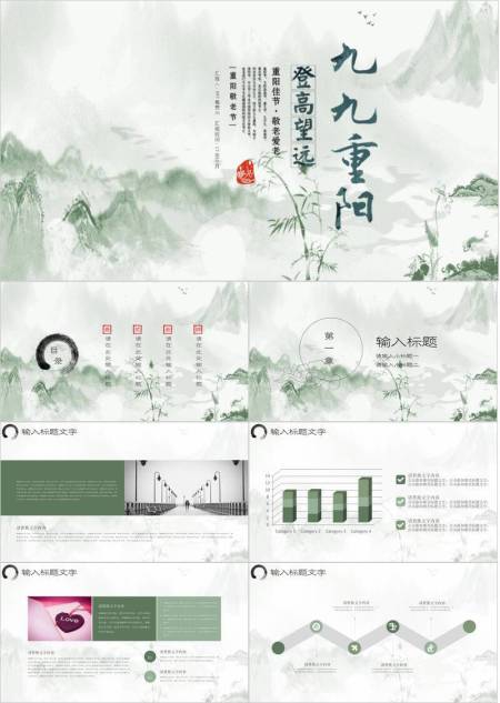 青色水墨重阳敬老倡议PPT模板