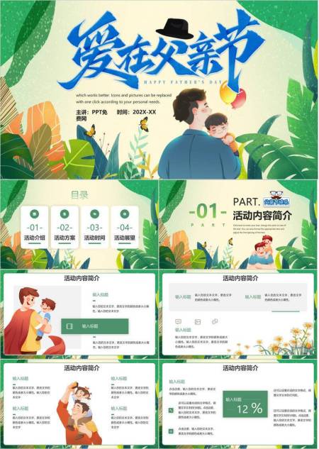 父亲节手绘热带风情家庭互动PPT模板