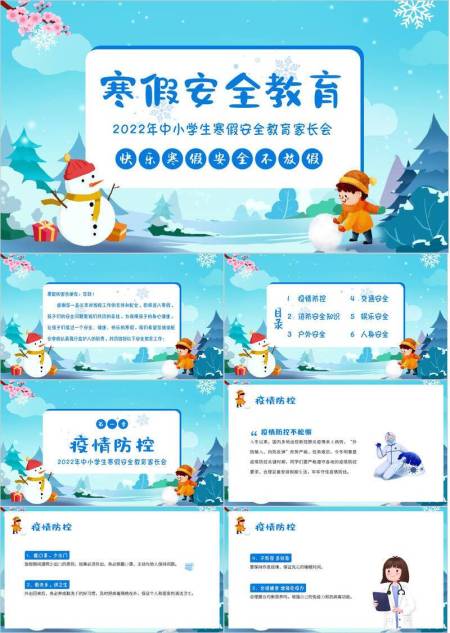 飘雪雪山儿童滚雪球寒假安全家长会PPT模板