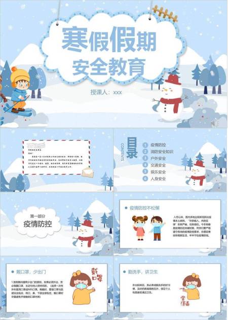 云朵边框悬挂男孩滑雪寒假安全通用PPT模板