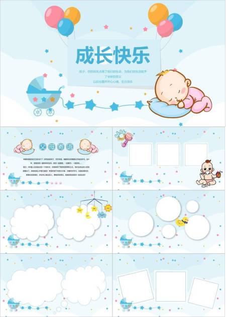 云朵婴儿车温馨生日成长纪念PPT模板