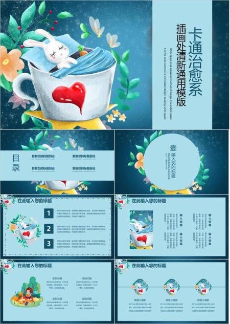 动漫感手绘兔子茶杯星空治愈系插画PPT模板