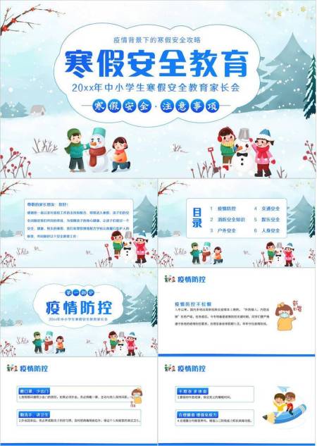雪地儿童堆雪人疫情寒假安全家长会PPT模板