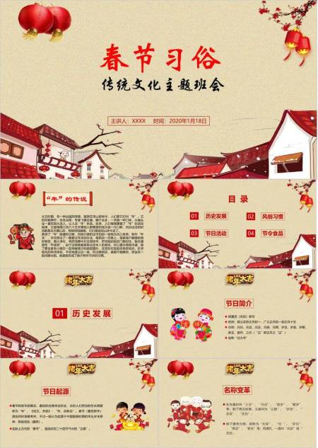 仿宣纸卡通建筑春节习俗主题班会PPT