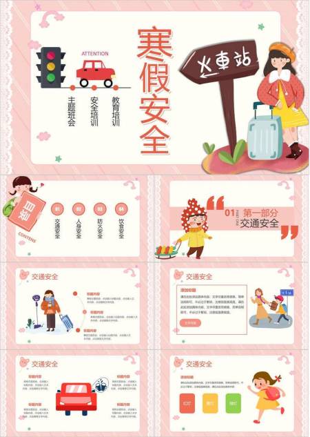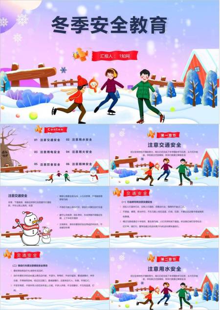 粉紫雪景儿童滑冰打雪仗寒假安全PPT模板